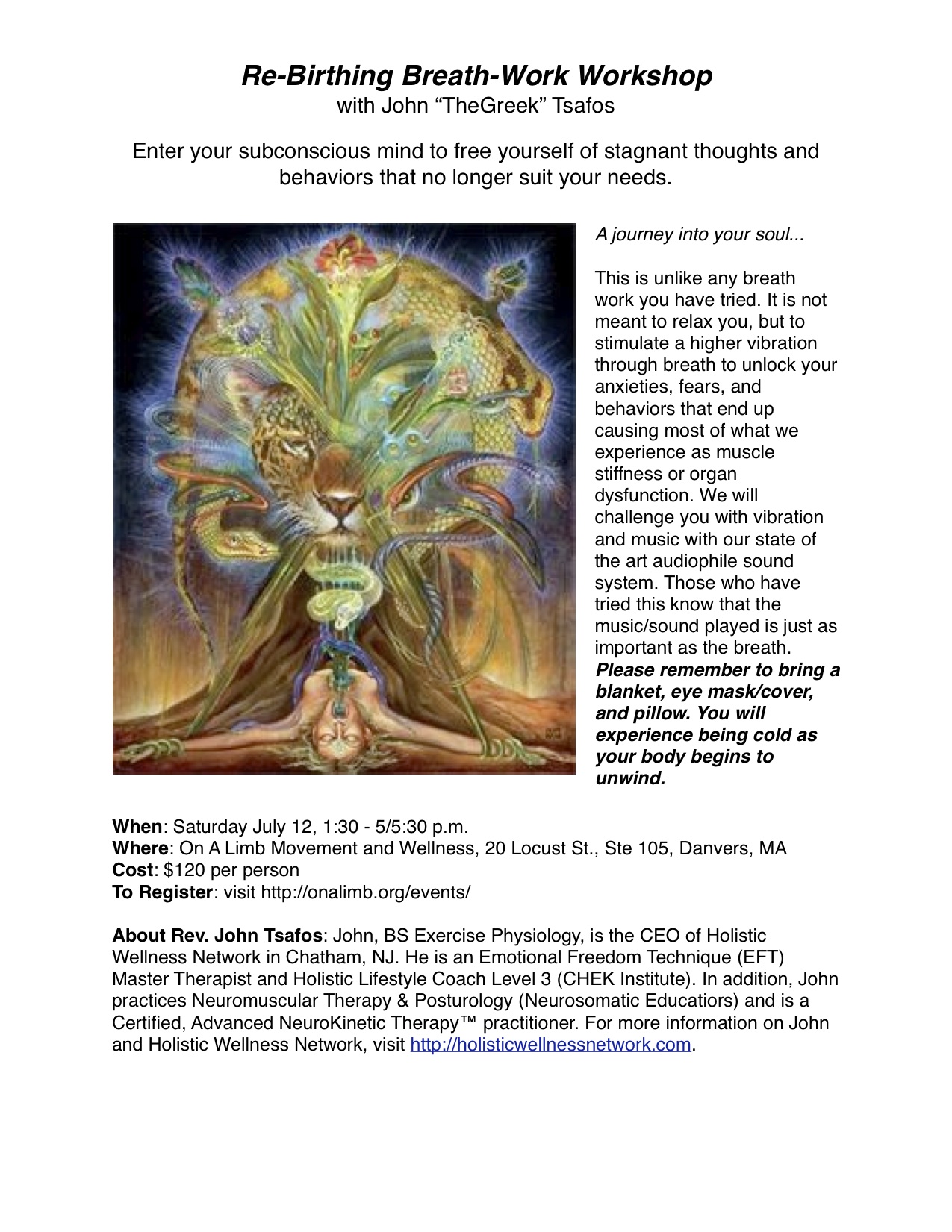 We’re excited to welcome John “TheGreek” Tsafos, CEO of Holistic Wellness Network in Chatham, NJ, and incredible practitioner, for a special 3.5 – 4 hour Re-Birthing Breath Work Workshop on July 12.